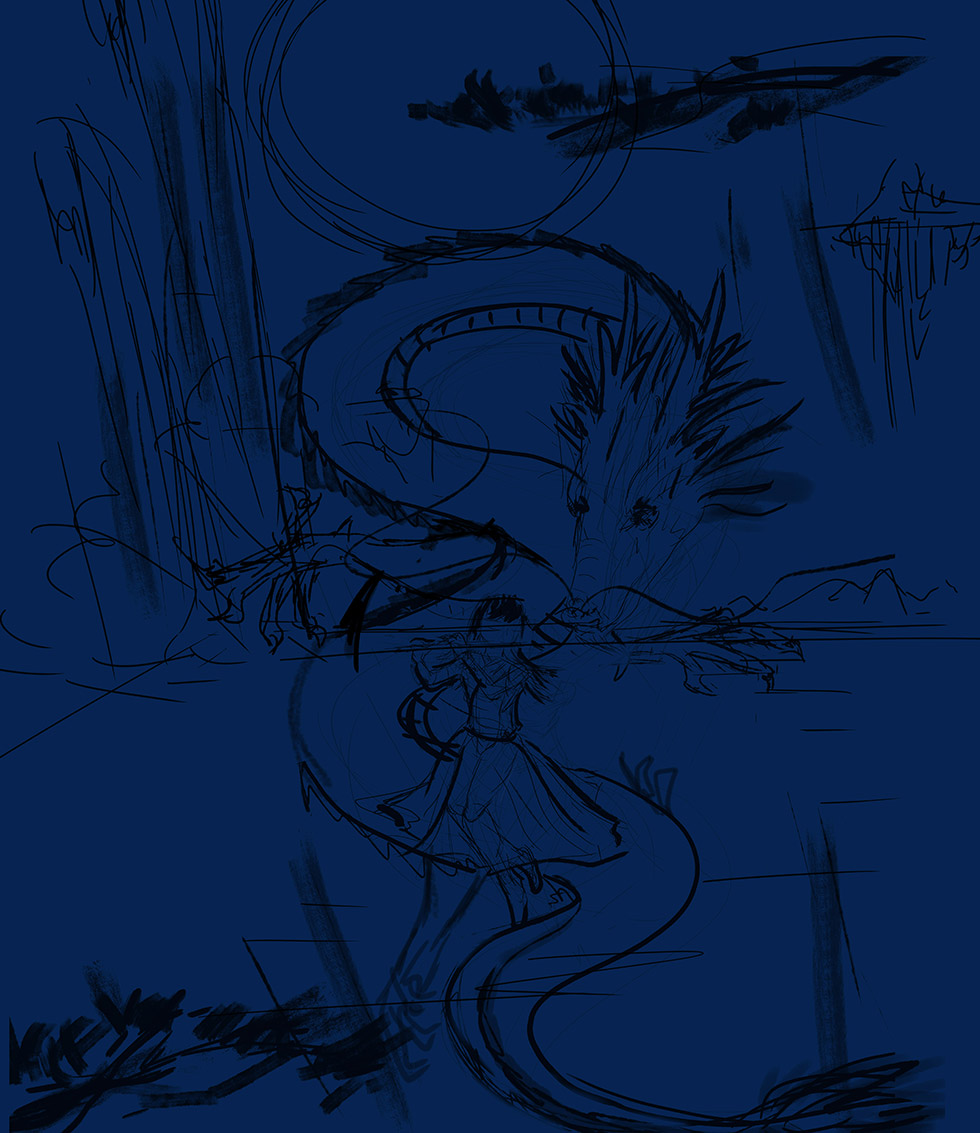 最初的画稿,原计划是在瀑布前,后来改成一个城市的夜景。就是螺蛳粉的故乡柳州,也称龙城。那里的晚上就是这样的