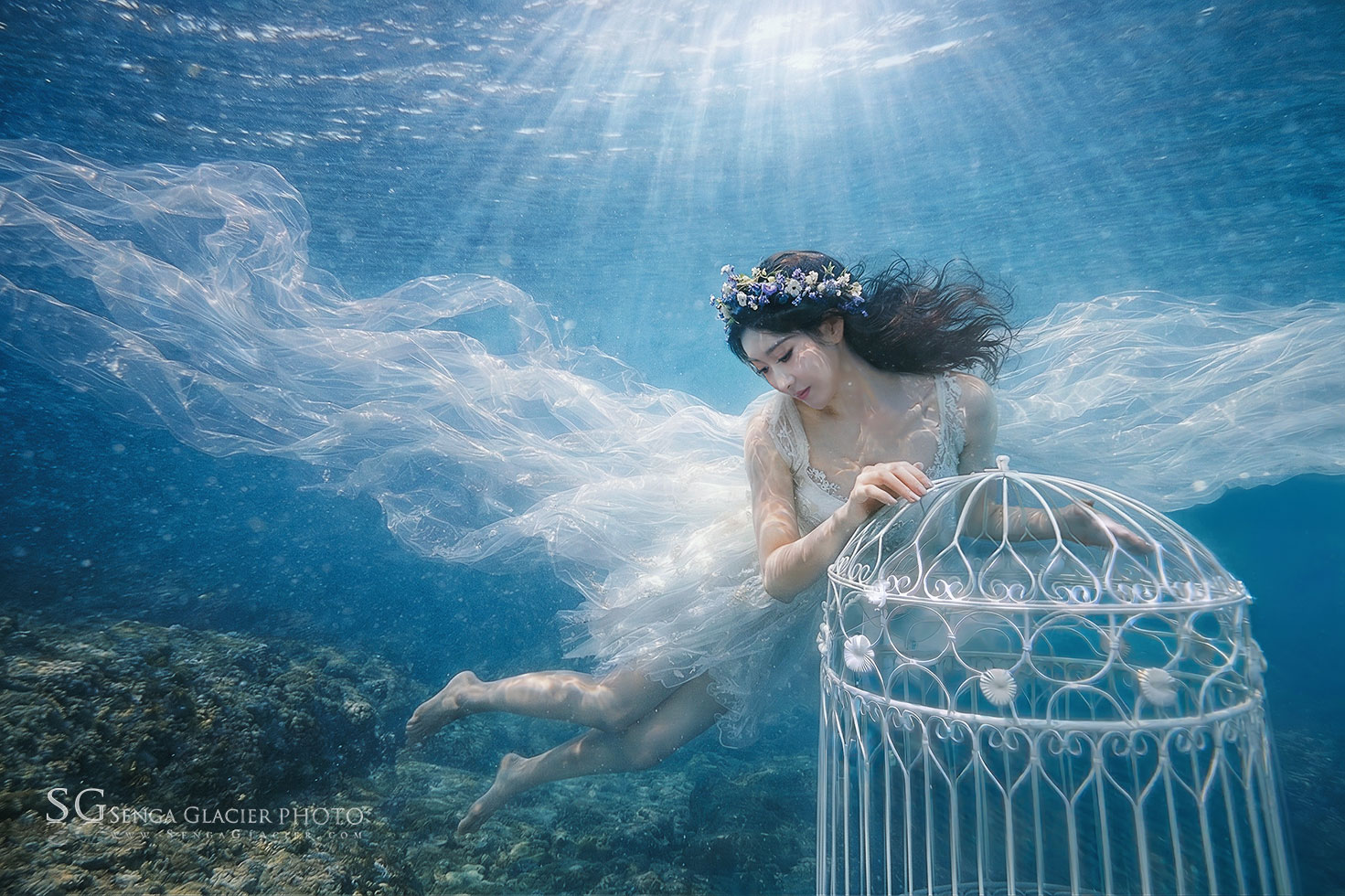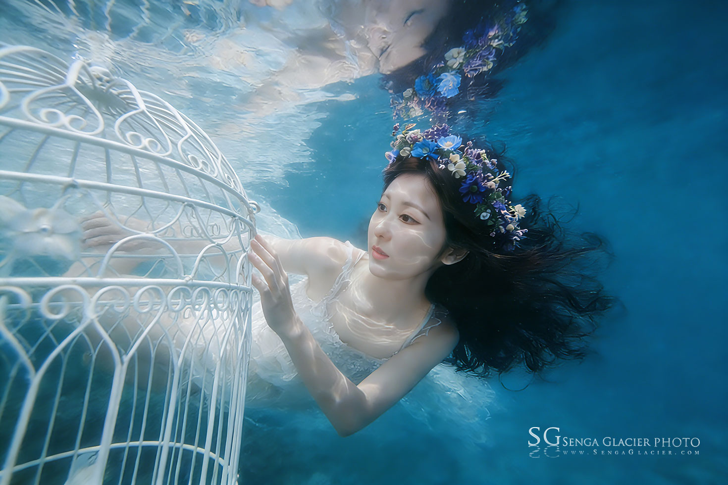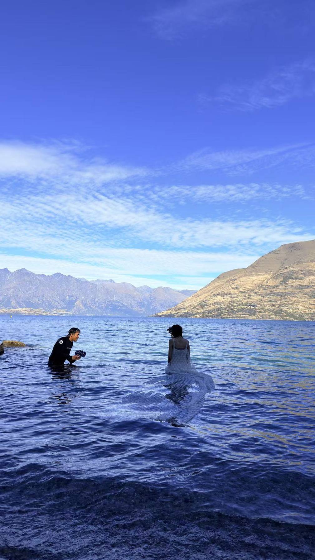 In the summer of 2026, I was shooting an underwater wedding session in Queenstown, New Zealand, at Lake Wakatipu. The model had a diving certification from Malaysia, but this was her first time entering the icy glacial waters of New Zealand’s South Island. These lakes are simply “cold” and “even colder,” with crystal-clear water like distilled liquid, though visibility varies with the weather. We stayed within about 3 meters of the surface. The birdcage prop was placed on a nearby rock ledge.