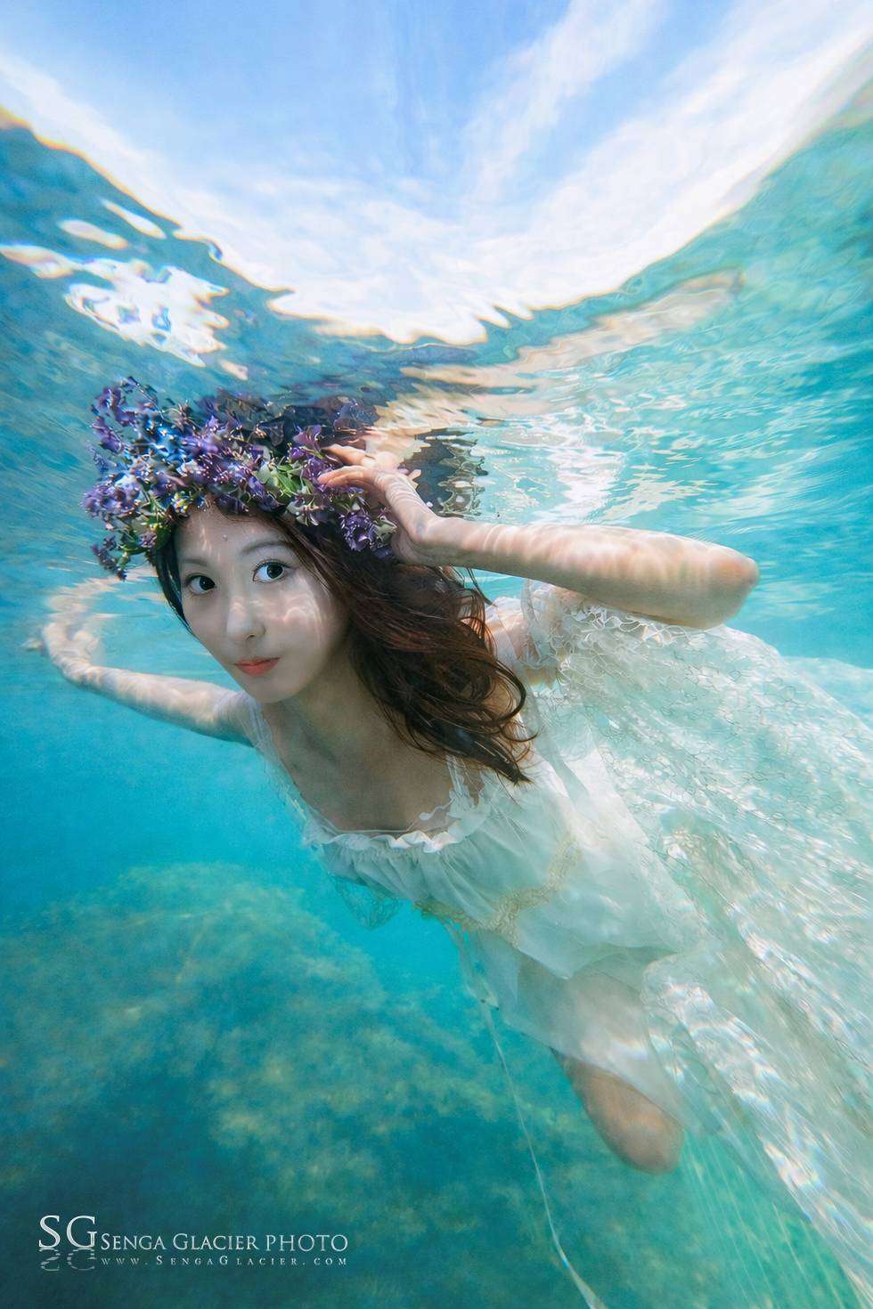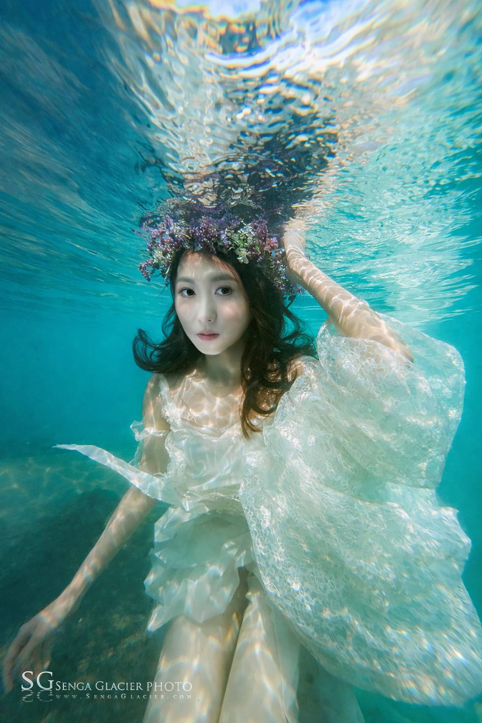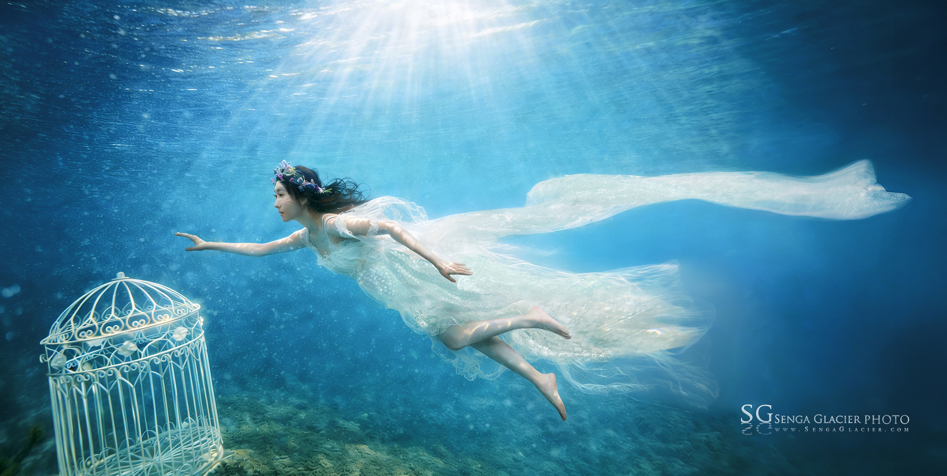 In the summer of 2026, I was shooting an underwater wedding session in Queenstown, New Zealand, at Lake Wakatipu. The model had a diving certification from Malaysia, but this was her first time entering the icy glacial waters of New Zealand’s South Island. These lakes are simply “cold” and “even colder,” with crystal-clear water like distilled liquid, though visibility varies with the weather. We stayed within about 3 meters of the surface. The birdcage prop was placed on a nearby rock ledge.