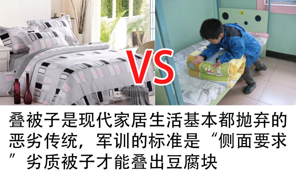军训要求叠被子——能叠成豆腐块的都是劣质棉花,有本事用鸭绒被试试。其实貌似传统中国才叠被子,现代中国人和西方都是铺床。人体上有大量的螨虫,螨虫喜欢生长在潮湿温暖的环境中,早上起床叠被子使空气进入被子中,是螨虫的生长得到氧气,便回大量生长,当人体再次进入被子中时,螨虫会随着呼吸进入体内引起疾病,也回诱发呼吸道疾病,最好不要叠被子,把被子平坦放着,没有空气进入被子,螨虫就没有水分,空气,就会被渴死,而且要注意房间多通风;