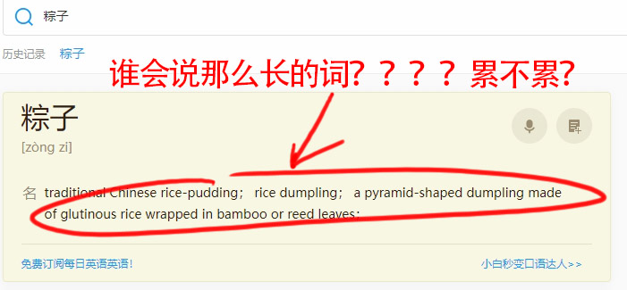 我说粽子,我就说zongzi,谁会傻到说traditional Chinese rice-pudding。