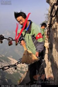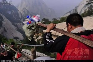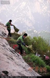 其实这还不是最难搞的,在那些风景旅游区,比如华山,只能靠工人高危操作再经过挑夫把垃圾挑下来。